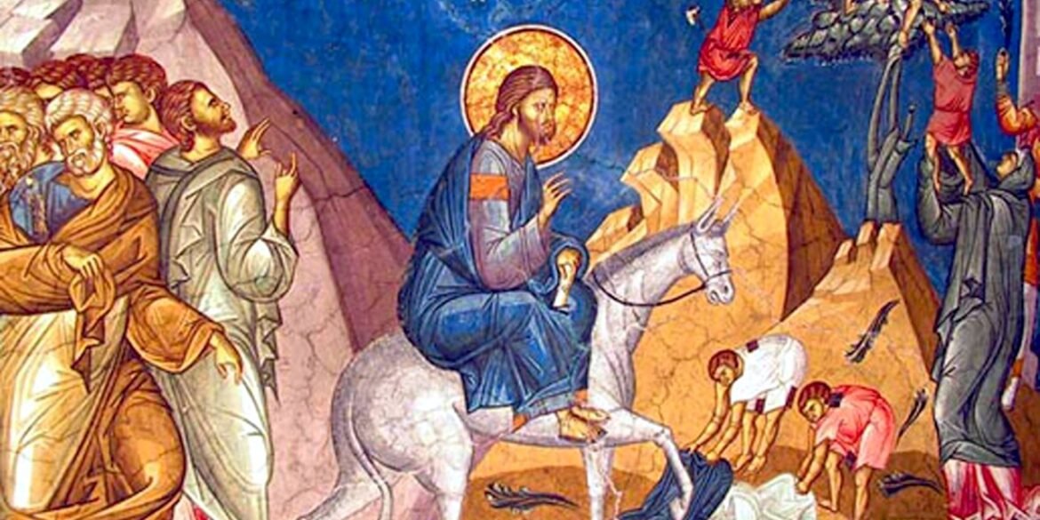 Prema predanju, Hristos je toga dana, jašući na magarcu, ušao u sveti grad, dok Ga je narod dočekivao kao Cara – prostirući haljine i noseći palmove grane, simbol časti i pobjede. Iako ga dočekuju uzvikom: „Osana Sinu Davidovu!“, Hristos plače nad Jerusalimom, znajući da ga u danima koji dolaze čeka izdaja, stradanje i smrt na krstu.