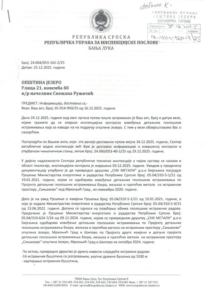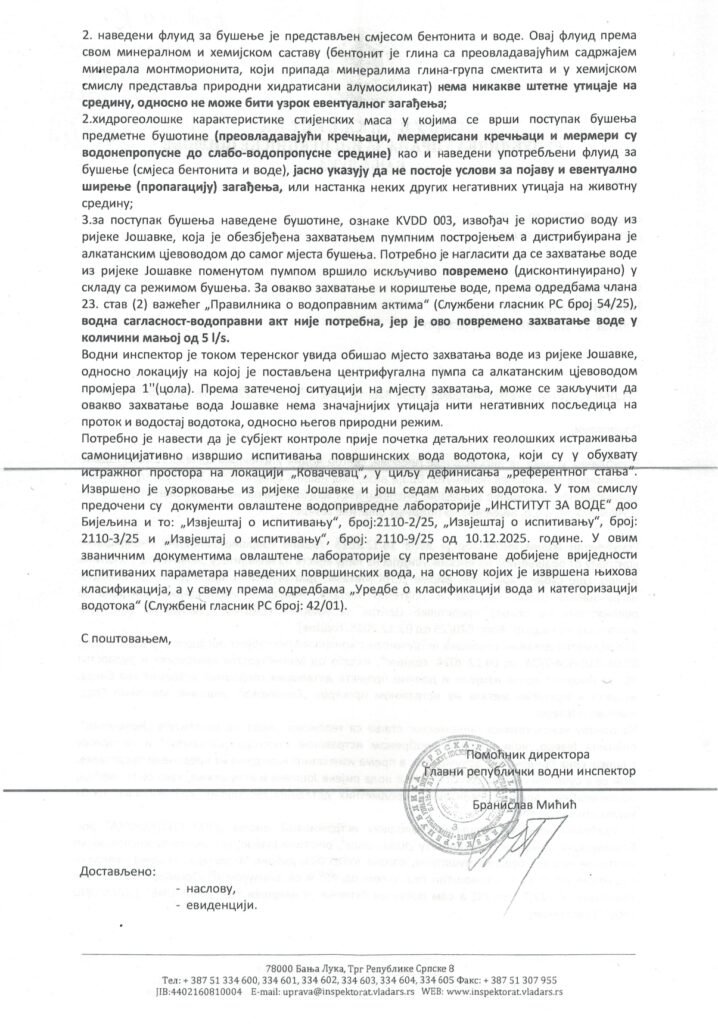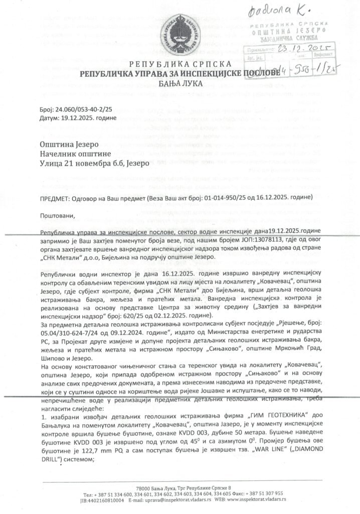 Radovi na detaljnim geološkim istraživanjima na lokalitetu Kovačevac, u opštini Jezero, izvode se u skladu sa važećim rješenjima i projektnom dokumentacijom, potvrđeno je u odgovorima Republičke uprave za inspekcijske poslove Republike Srpske, dostavljenim Opštini Jezero krajem decembra 2025. godine.