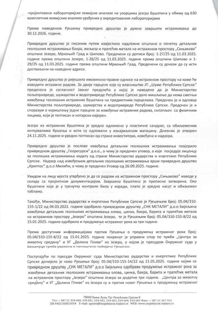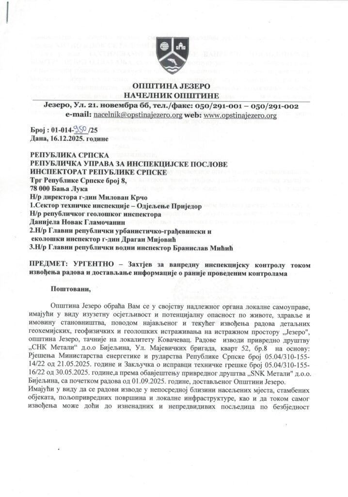 Inspekcijski nadzor uslijedio je nakon što je Opština Jezero 16. decembra 2025. godine uputila urgentan zahtjev za sprovođenje vanredne inspekcijske kontrole tokom izvođenja radova detaljnih geoloških istraživanja, upozoravajući na osjetljivost terena i mogući uticaj radova na stanovništvo, životnu sredinu i lokalnu infrastrukturu.