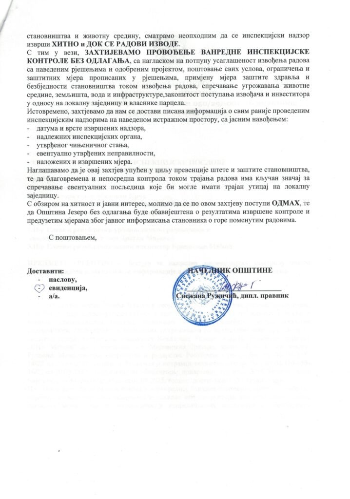 Opština Jezero je, prema navodima iz ranije upućenog zahtjeva, insistirala na hitnosti nadzora zbog javnog interesa i potrebe zaštite stanovništva. Iz Inspektorata su naveli da su sve tražene informacije o provedenim kontrolama dostavljene, te da će nadležni organi i dalje pratiti izvođenje radova u okviru svojih zakonskih ovlašćenja.