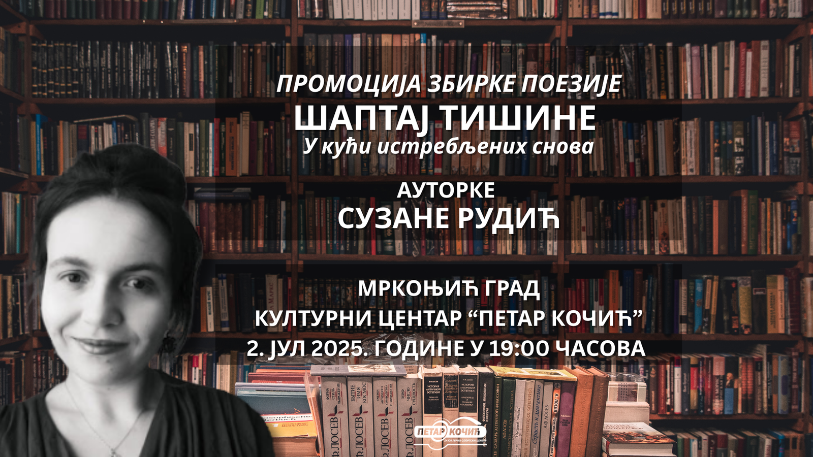 Kulturni centar „Petar Kočić“ u Mrkonjić Gradu biće domaćin promocije najnovije zbirke poezije mlade autorke Suzane Rudić pod naslovom Šaptaj tišine – U kući istrebljenih snova. Događaj je zakazan za srijedu, 2. jul, s početkom u 19:00 časova, i predstavlja jedan od značajnijih kulturnih događaja u okviru ljetnjeg programa centra.