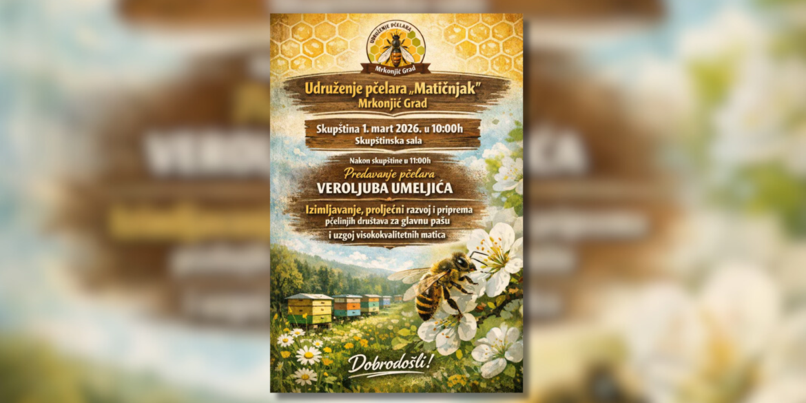 MRKONJIĆ GRAD – Udruženje pčelara „Matičnjak“ Mrkonjić Grad organizuje sutra, 1. marta 2026. godine, redovnu skupštinu, koja će biti održana u Skupštinskoj sali sa početkom u 10 časova.